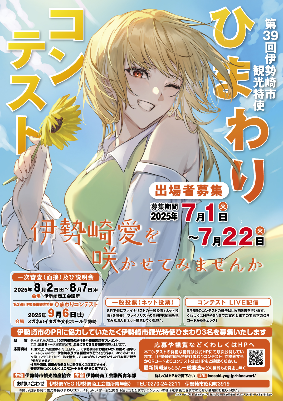 第39回伊勢崎市観光特使ひまわりコンテストにたくさんのご応募を頂き誠にありがとうございました。出場者募集は7月22日をもちまして終了しました。